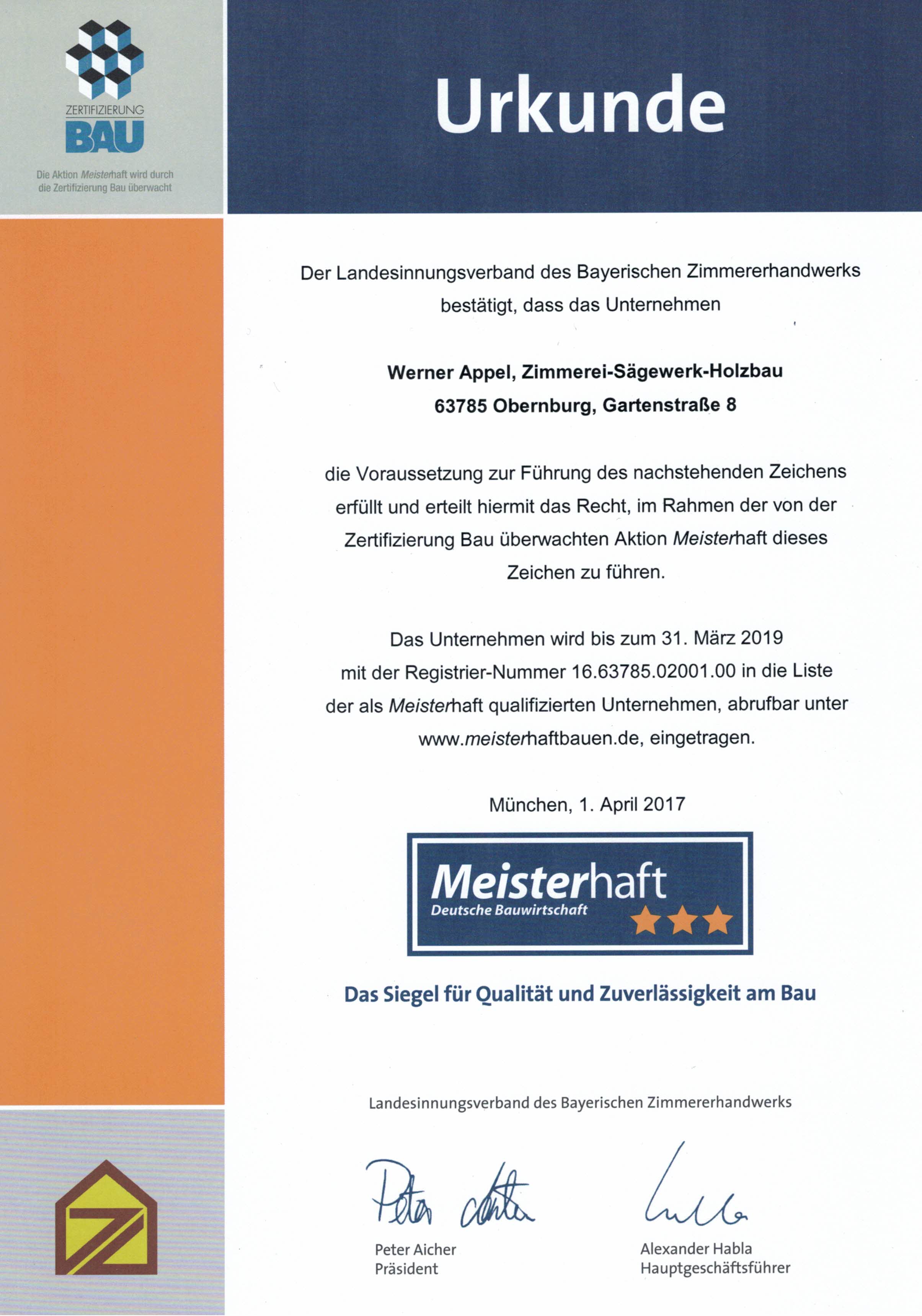 Durch die Teilnahme an verschiedenen Weiterbildungsmaßnahmen konnte unser Unternehmen wieder die entsprechenden Voraussetzungen erfüllen um sich abermals für Meisterhaft*** zu qualifizieren. Deshalb wurde uns zum 01.04.2017 die entsprechende Urkunde verliehen.